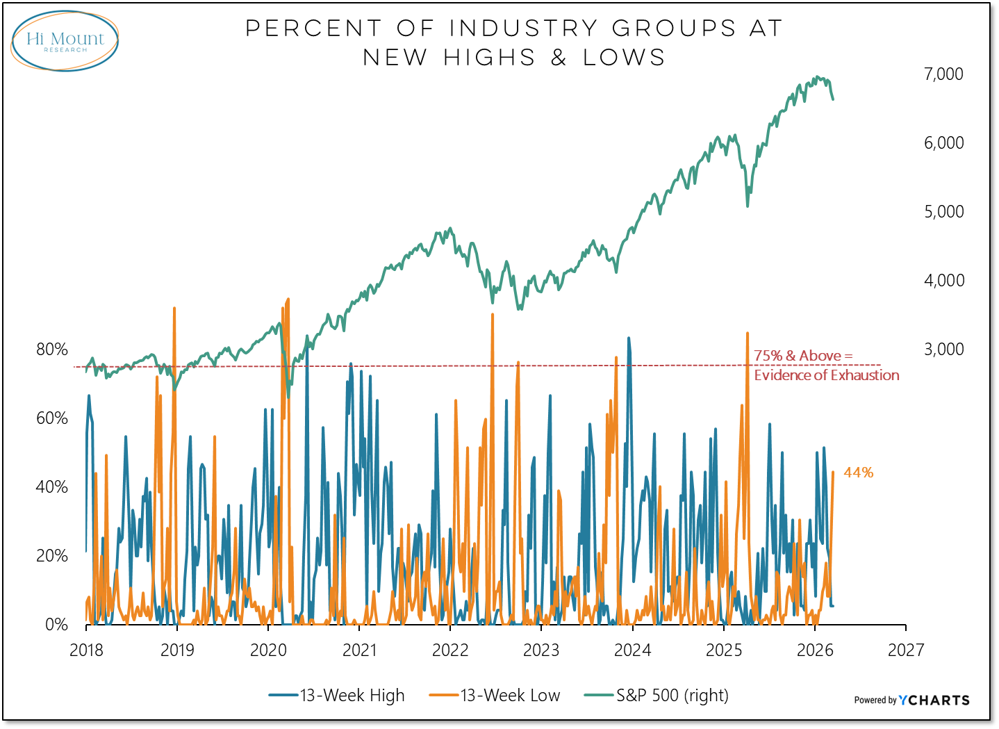 Before getting into the implications of seeing more stocks make new lows than new highs and the looming expiration of last year’s Breadth Thrust Regime, it may be useful to think about the difference between broad market deterioration and evidence of exhaustion. For example, we have seen an expansion in the percentage of industry groups at new 13-week lows in recent weeks, but it has not deteriorated to the point of signaling that selling has become exhausted. In other words, stocks may bounce, but the buyability of that bounce remains in question.