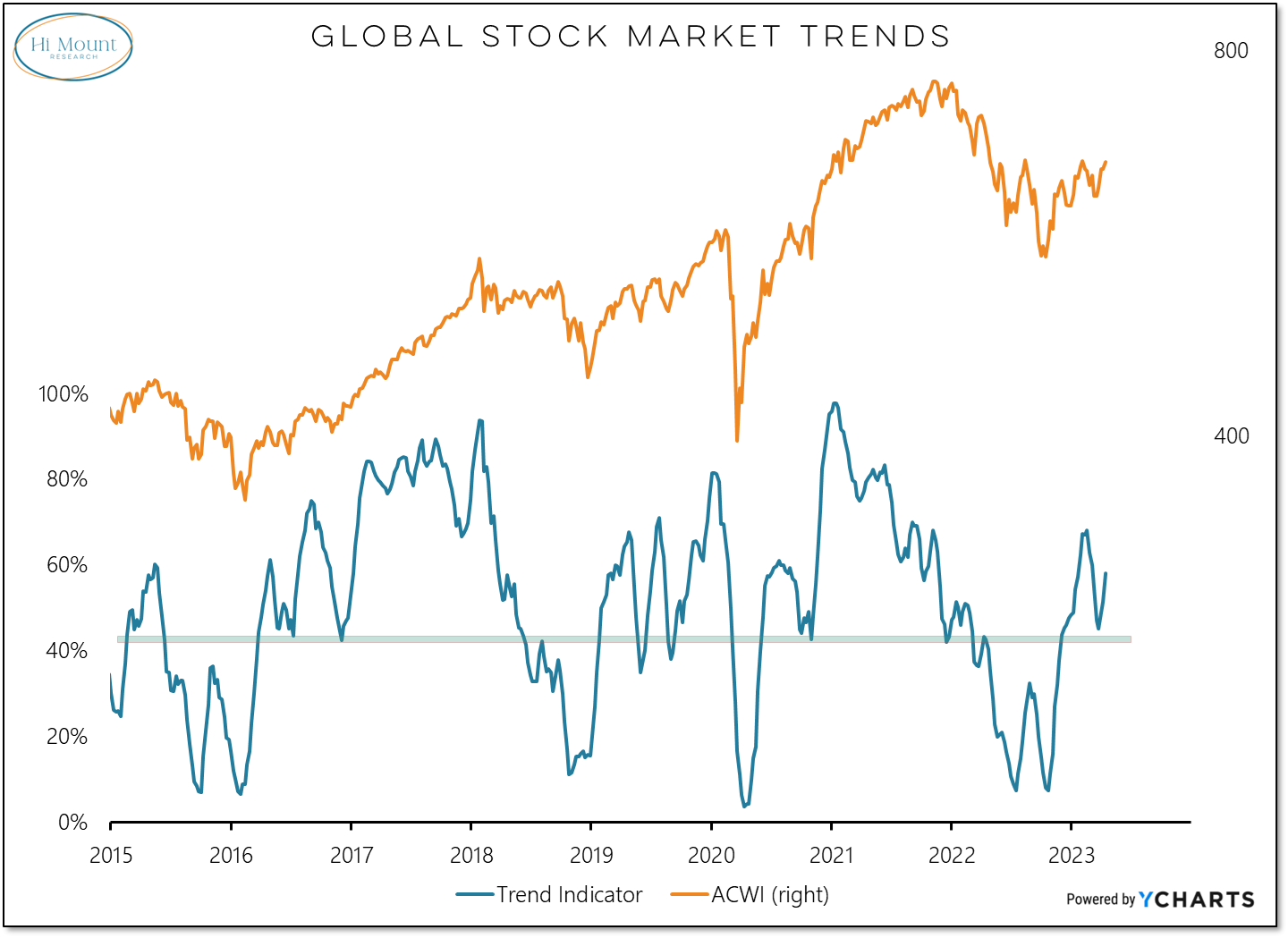 Our ACWI market-based global trend indicator surged from less than 10% in October to nearly 70% in February. After following a typical consolidation pattern off the lows, this indicator is rising again. Global equity markets aren’t just relative (versus the US) leaders, they are sources of absolute strength.
