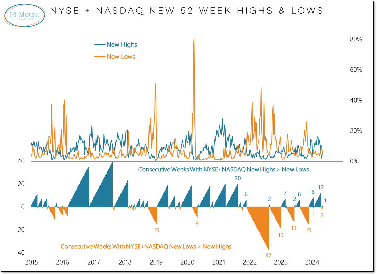 The weekly data on new highs and new lows turned positive last week and that pushed our overall checklist to 4 of 6 components reflecting bull market behavior.