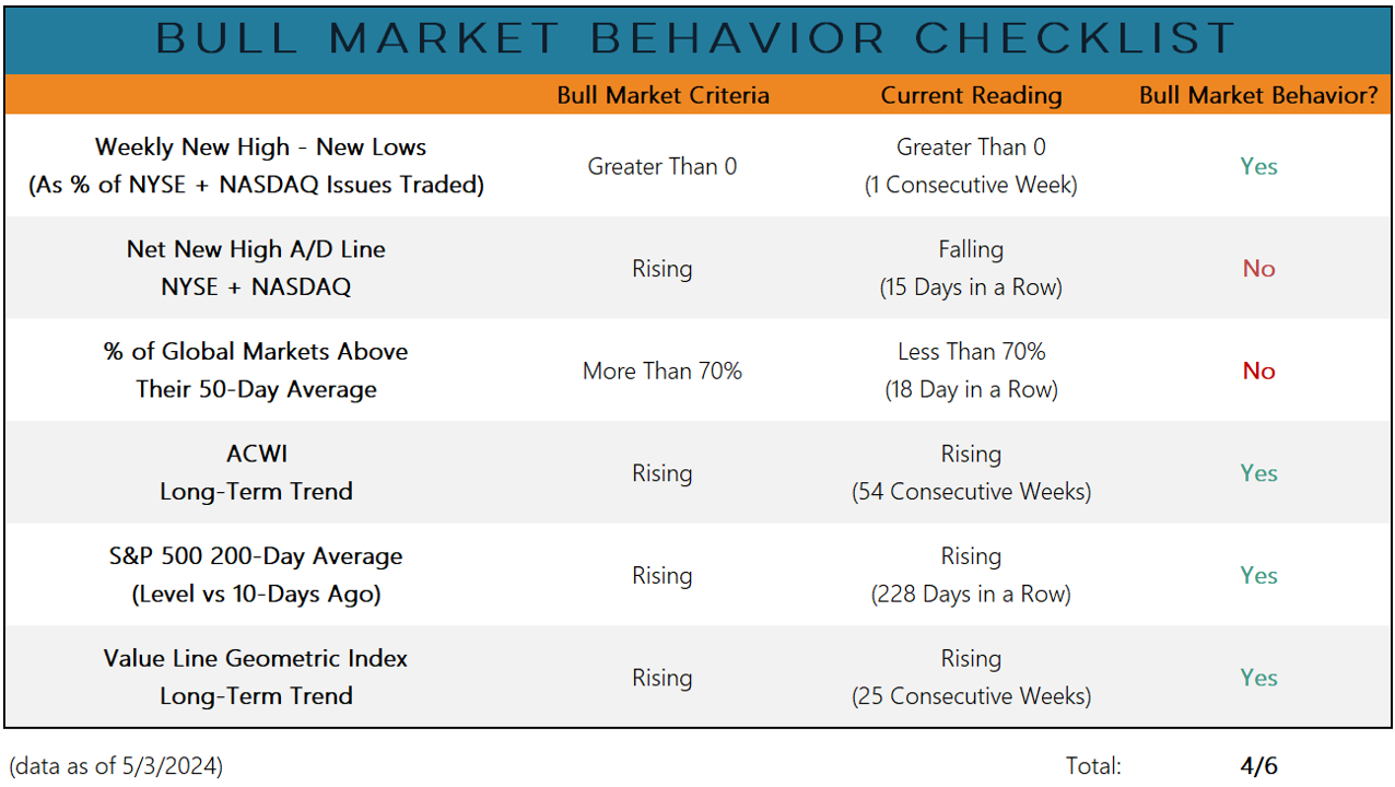 Coming into this week, the ball was in the bulls court, but they still had work to do. The price trend components on our Bull Market Behavior Checklist stayed positive in April, but breadth had turned suspect. The percentage of ACWI markets above their 50-day averages collapsed and on both a daily and weekly basis, new lows outnumbered new highs.