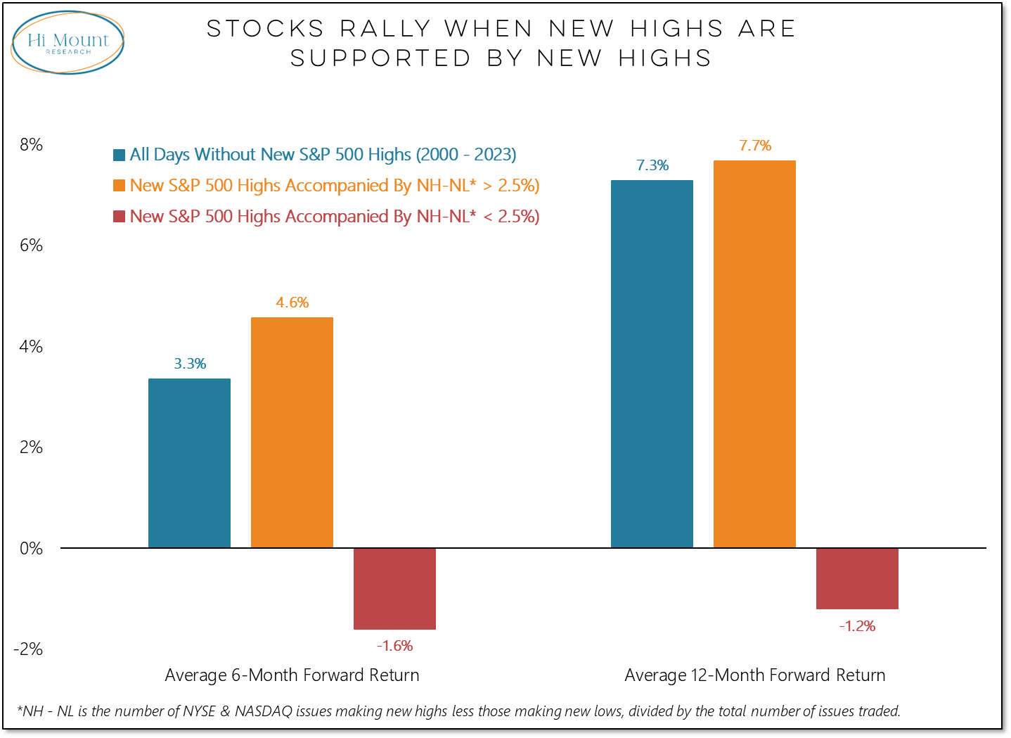 The S&P 500 made a new high last week, as did a host of other stock market indexes in the US and around the world. On a net (new highs less new lows) basis, 5.9% of individual stocks joined the indexes in making new highs. This was not elevated by historical standards it was extensive enough to avoid a caution flag that gets raised when a new high at the index-level is not supported by ample new highs beneath the surface.