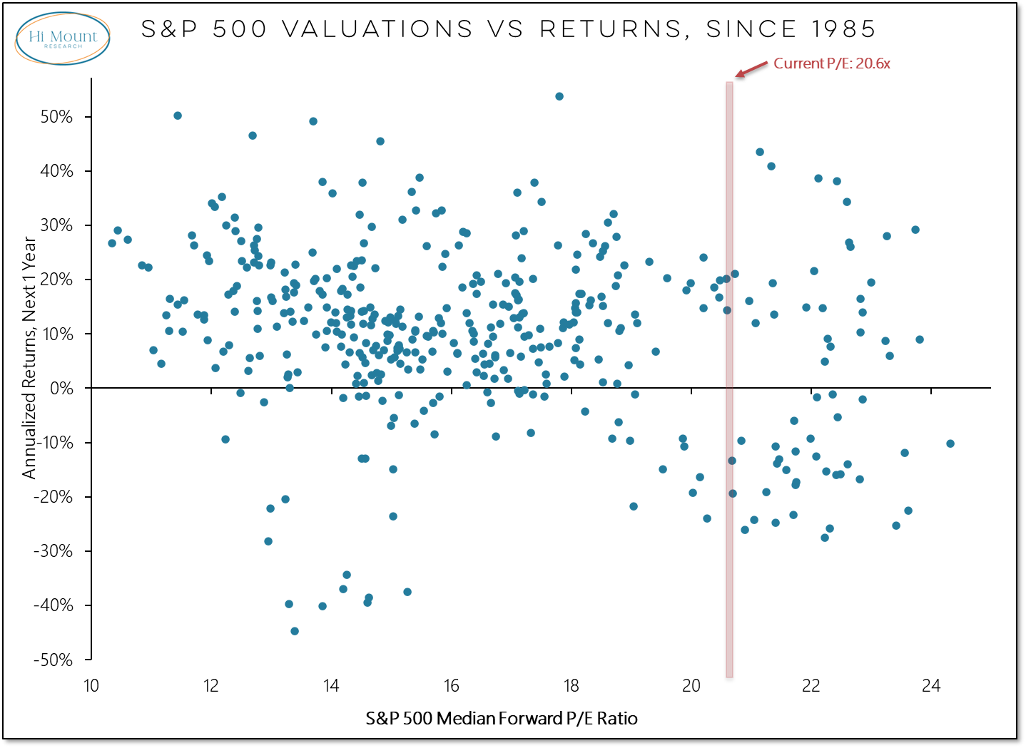 Valuations are not great guide for where for where the market could be headed over the coming year. Stocks that are cheap can get cheaper, stocks that are expensive, can remain so for uncomfortably long periods of time. To quote J.M. Keynes, “the market can stay irrational longer than you can stay solvent.” The scatterplot showing the relationship between the S&P 500’s forward P/E ratio and the market’s return over the following year is a shapeless cloud largely devoid of meaning.