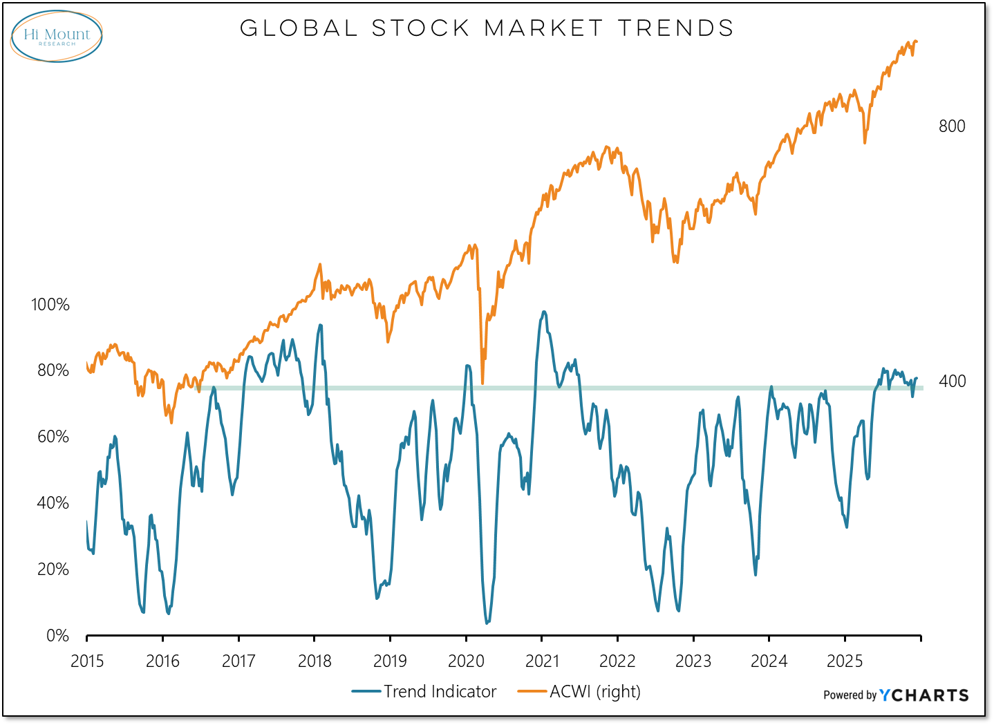 Trends have been stronger and participation broader around the globe than in the US for most of this year. Global trend strength in the latter part of 2205 has been reminiscent of the experience of 2017 and 2021. The lesson from the past is that market risks increase after these longer-term trends start to break down.