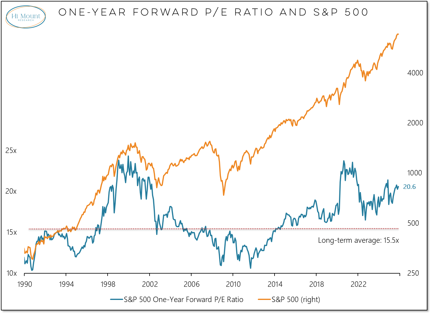 While US stocks may be losing leadership, they continue to trade at an elevated multiple relative to expected earnings. The forward P/E ratio for the S&P 500 is above 20x, not a historical high but certainly elevated versus the long-term average near 15x.