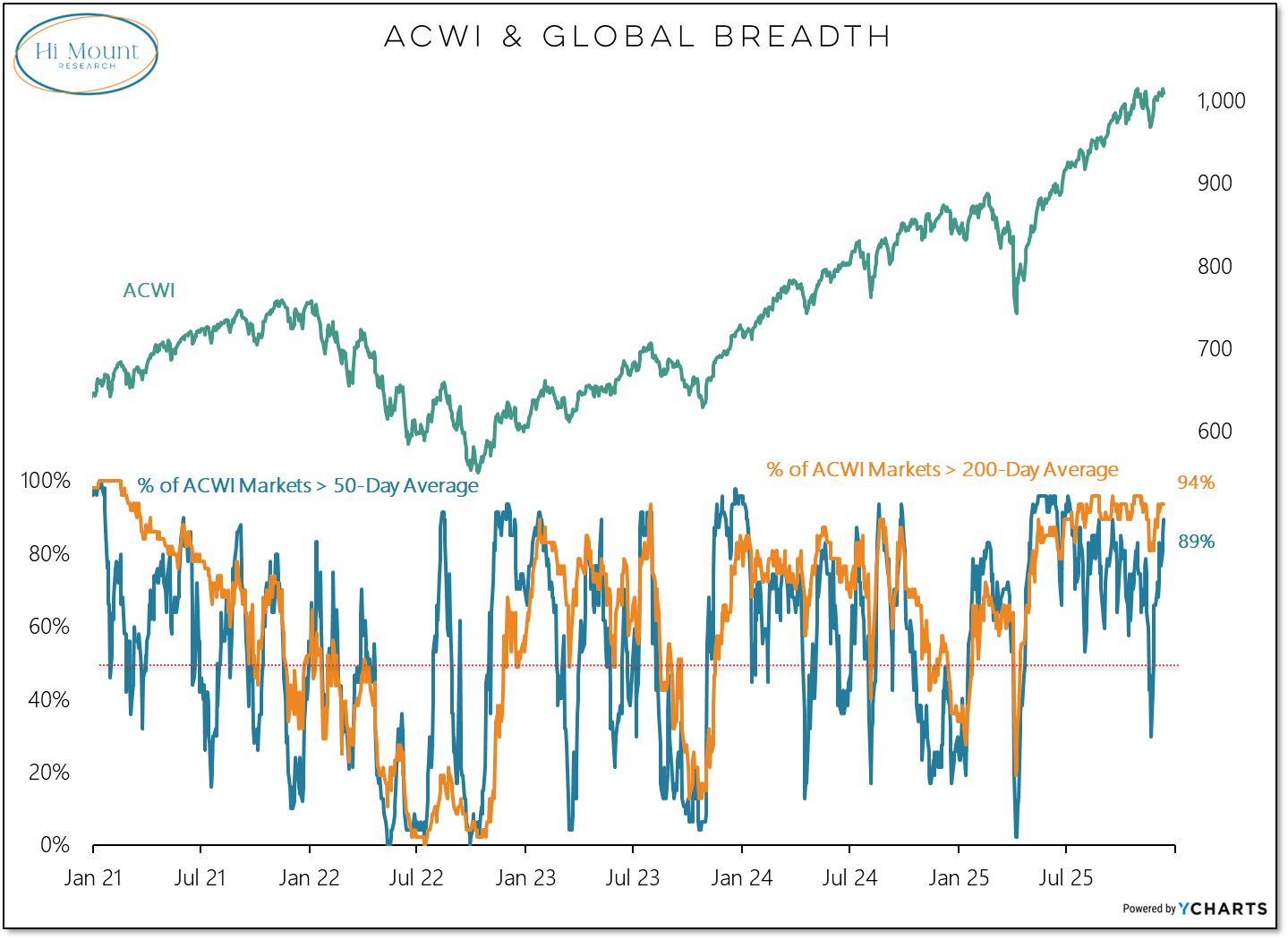 When we look around the world, we see that the percentage of ACWI markets trading above their 200-day averages has remained elevated and is currently in the mid 90’s. Persistent strength from a longer-term perspective has helped buoy shorter-term prospects and supported the recent recovery in the percentage of ACWI markets trading above their 50-day averages. Last month it was below 30% and last week it was approaching 90% and matching its highest level since mid-year.