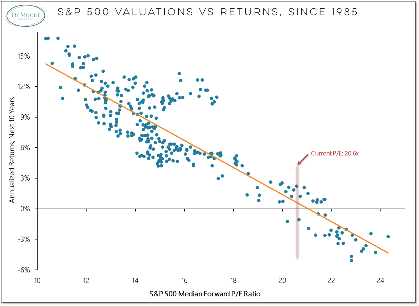 Valuations can be one of the most important gauges for considering potential risks and rewards over the longer-term. The scatterplot cloud coalesces around a trendline when we extend our time horizon. The inverse relationship between starting P/E ratio and annualized returns over the next decade is a stark reminder that the risks and returns in stocks over the next 10 years are unlikely to match the experience of the past 10 years. Only 9 out of the 344 (<3%) months with positive forward 10-year returns have had a starting valuations higher than we are now (and even then the returns barely kept up with inflation). Of the 28 months with negative forward 10-year returns, only a single on had a P/E ratio lower than the current level.