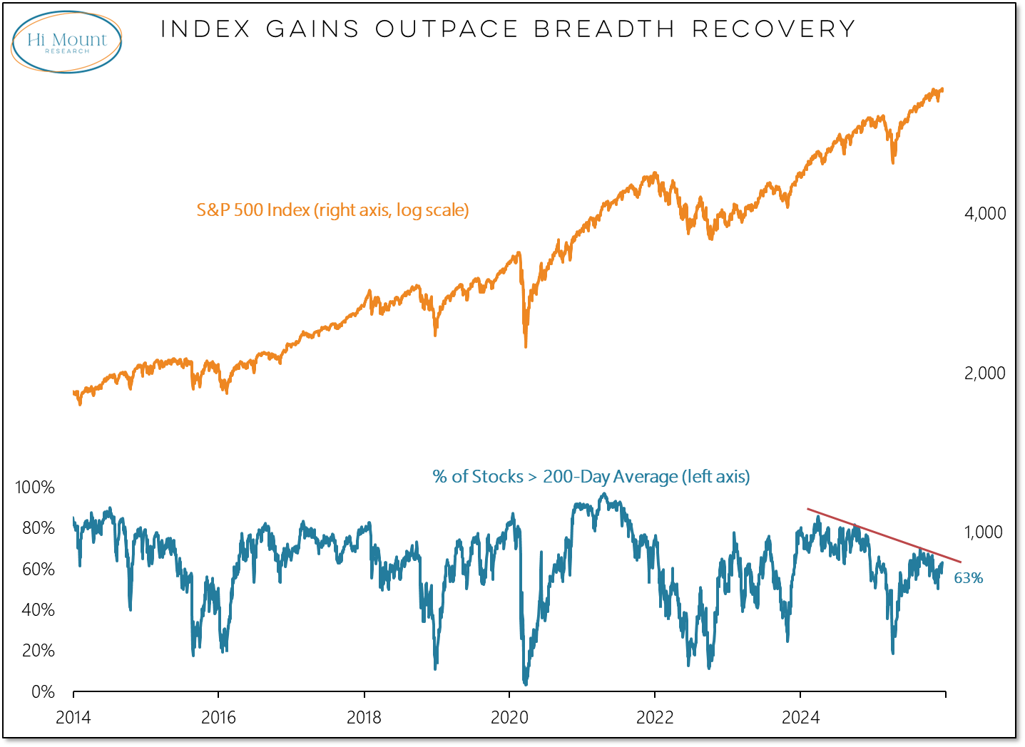 While the number of stocks making new highs is supportive of further index-level gains, the number of stocks trading above their 200-day average peaked in early 2024 and has been out of gear with the index since. Clearing up this divergence would be a feather in the cap for bulls and could signal a period where the index is led from the bottom up rather than the top down. New highs last week from mid-caps, small-caps and the equal-weight S&P 500 suggest this transition may indeed be in the works.
